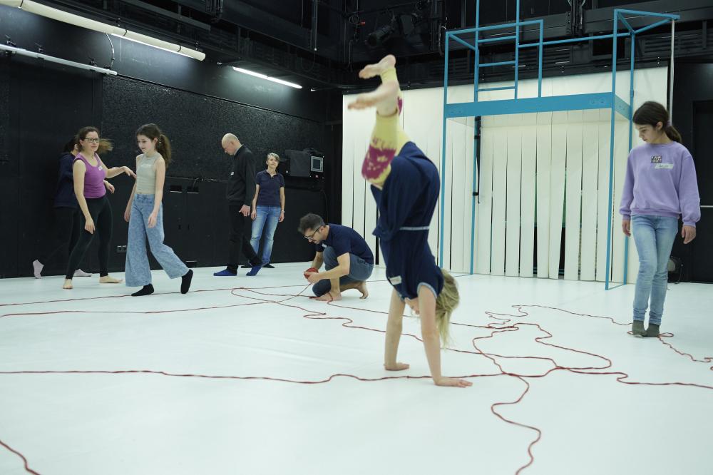Manchmal braucht es gar nicht viele Worte, um Szenen, Landschaften oder auch Gegenstände entstehen zu lassen. Es braucht nur Körpersprache, Ausdruck und aufmerksame Beobachter*innen. Mit dem Schauen und dem Spielen beschäftigt sich der Workshop von Schauspieler Michael Heuberger. Den leeren Ballettsaal verwandeln Stella und Peter vor den Augen der Zuschauer*innen nur durch Gestik und Mimik in einen Kühlraum. Weiter geht es auf eine Blumenwiese und in den Zuschauerraum eines Theatersaals, bis wir schließlich einem handfesten Ehestreit beiwohnen – alles ganz ohne Worte. Unter Michaels Anleitung werden wir zu Marionetten, die an Fäden gezogen vom Boden aufstehen oder zu Skulpturen, die es von allen Seiten zu betrachten gilt. Wie ist das Handgelenk gedreht? Welcher Sichtachse folgt der Blick? Wie ist die Stellung des linken Fußes zum rechten? Als wir uns zum Schluss pantomimisch Tiere überreichen wird ein Krokodil zu einem Regenwurm, zu einem Eichhörnchen und schließlich zu einem Schmetterling.