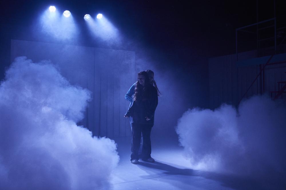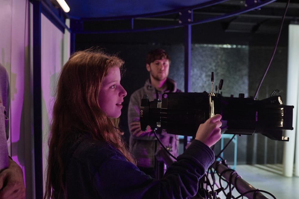 Den Technikworkshop, der auf, neben und über der Bühne des Jungen Theaters stattfindet, beginnen wir mit „Laut“. Die drei Veranstaltungstechniker Andi, Max und Michel zeigen uns nicht nur, das es für verschiedene Zwecke verschiedene Mikrofone gibt, sondern auch, was man mit ihnen alles bewirken kann: Mit den richtigen Effekten klingt ein kleiner Raum plötzlich wie eine große Kirche und ein Kind wie ein Roboter. Anschließend wird es „Hell“. An zwei verschiedenen Stationen können die Scheinwerfer analog oder digital ausprobiert werden. Am Lichtpult können wir nicht nur Farbe und Helligkeit steuern, sondern mit sogenannten „Gobos“ auch Muster und Effekte im Bühnenraum entstehen lassen. Etwas ruhiger geht es hingegen an den „Profil“- Scheinwerfern zu, die per Hand eingestellt werden. Gar nicht so einfach, damit ein Viereck passgenau auf eine Tür auszurichten… Gegen Ende dürfen alle einmal ausprobieren, wie es sich auf der Bühne anfühlt, im Frontlicht, Gegenlicht oder Gassenlicht zu stehen, aber auch wie es vom Zuschauerraum aussieht, wenn jemand im dichten Nebel verschwindet.