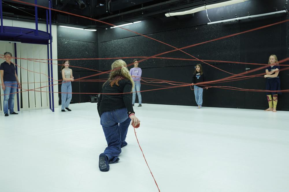 sichtbares Netz uns alle miteinander verbindet. Nun geht es drunter hindurch und drüber hinweg, auf dem Netz balancierend und in den Zwischenräumen tanzend, alle sind in Bewegung, alle sind in Begegnung.